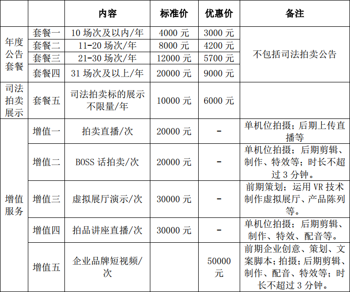 答:一是非司法拍卖企业根据自身经营情况选择“年度公告套餐”。二是司法拍卖企业根据实际情况选择“年度公告套餐”和“司法拍卖展示”两项,或“年度公告套餐”单项,或“司法拍卖展示”单项。三是拍卖企业根据实际情况选择或不选择“增值服务”项。