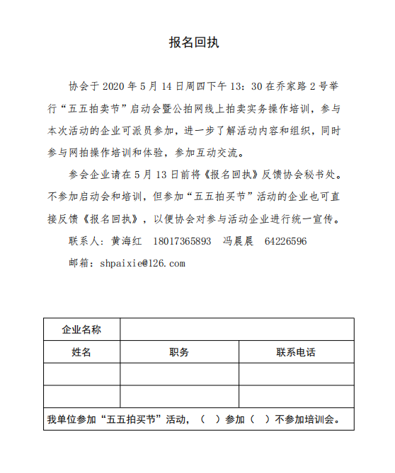 协会于2020年5月14日周四下午13:30在乔家路2号举行“五五拍卖节”启动会暨公拍网线上拍卖实务操作培训,参与本次活动的企业可派员参加,进一步了解活动内容和组织,同时参与网拍操作培训和体验,参加互动交流。参与企业请在5月13日前将《参会回执》反馈协会秘书处。